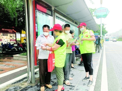 本报讯(记者庄盈 文/摄)6月4日,市中心不少公交站台上出现了一群身穿绿色背心的志愿者,他们头戴小红帽,胸挂“志愿者”工作牌,手持“志愿服务队”旗帜和“请排队上车 礼貌让座”提示牌,...