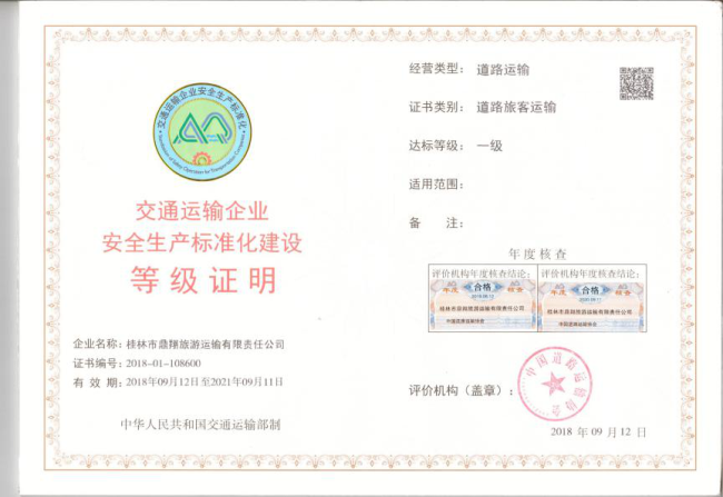 近日,受交通运输部委托中国道路运输协会专家评定小组对鼎翔旅游公司安全生产标准化建设一级达标进行2020年度核查,鼎翔旅游公司顺利通过此次年度核查。安全生产标准化年度核查考评工作是2020年鼎翔旅游公...