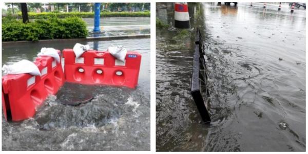 机场路香江饭店路段积水严重,应急人员第一时间摆放警示标志,拉起警戒线,安排人员值守,打开雨水井盖及雨水箅子加快排水,与交警部门互通信息,劝导行人绕行,全力保障人民群众安全。