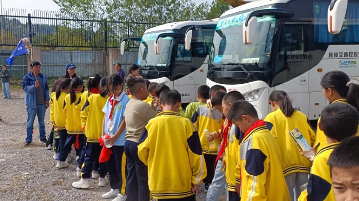 “请各位同学系好安全带,我们准备出发了!”10月23日,阳朔山水公司旅运公司7辆48座新能源大巴车载着300余名师生,从平乐实验中学出发前往阳朔如意峰开启研学之旅。