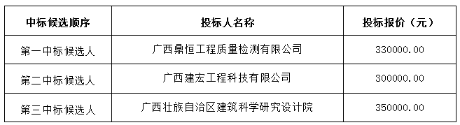 四、评审小组中标公告公示结束后,确定广西鼎恒工程质量检测有限公司为本项目中标人,中标金额为人民币叁拾叁万元整(¥330000.00元)。