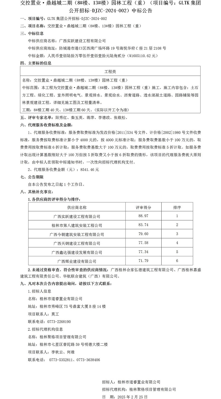交控置业·鼎越城二期(8#楼、13#楼)园林工程(重)(项目编号:GLTK集团公开招标-DJZC-2024-002)中标公告