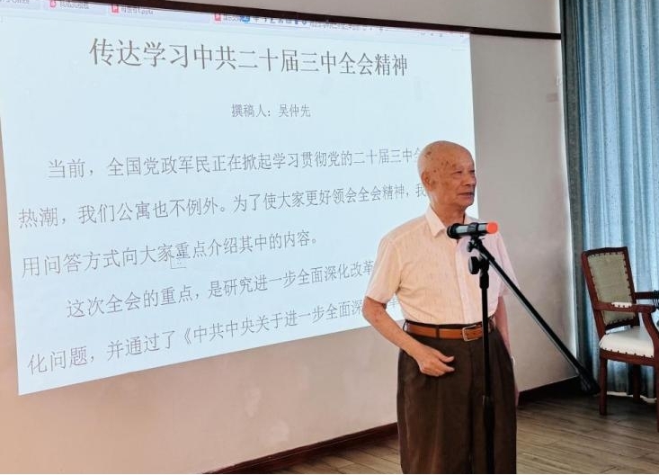 经过一周的精心准备,吴爷爷穿上正装、戴上党徽,精神抖擞走上演讲台,为养老院的老同志们传播党的知识理论,宣讲党的二十届三中全会的重大意义和深远影响。内容丰富、通俗易懂的宣讲方式,让老同志和公寓党员干部们深受教育。