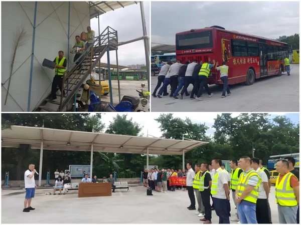 6月23日,滨北车场灵川始发站场站举行了一场实战性防汛演练。模拟受强降雨、洪峰及水库泄洪影响,桂林站水位超警戒应急处置。公交公司启动二级应急响应。场站迅速启动预案,集结应急队员,按规划路线将车辆转移至安全地带。应急成员24小时轮班值守,监测水位,洪水消退后移车回场,恢复正常运营,展现了应对大规模洪水灾害时场站的整体调度和车辆转移能力。