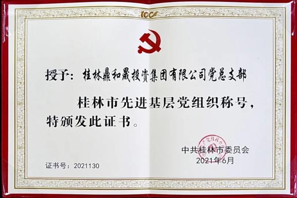 在庆祝中国共产党成立100周年之际,桂林鼎和晟集团党总支被中共桂林市委员会授予“桂林市先进基层党组织”称号。