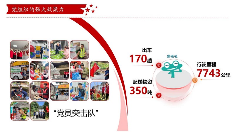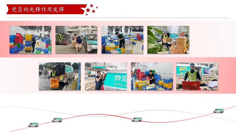 鼎和晟供应链党支部把小组建在车队,团结带领全体员工冲锋在前、勇挑重担,在乡村振兴、抗洪救灾等重大任务中形成了强大的凝聚力和战斗力。在集团公司驻点帮扶的灌阳县新街镇上甫村,“鼎呱呱”新能源物流车化身“乡村振兴助力车”,抢运生鲜农产品,打通物流配送“最后一公里”;在“6·19”特大洪涝灾害中,鼎和晟供应链秒变“突击队”,克服困难配送物资,让市民喝上“放心水”、吃上“放心菜”,进一步体现了企业的责任和担当。
